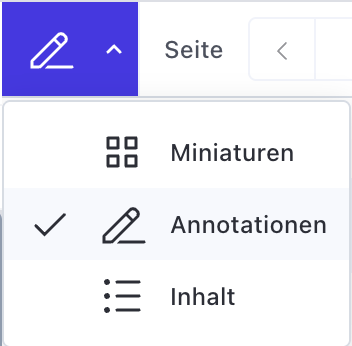 Die Übersicht über alle Notizen in Ihrem Dokument, gegliedert nach Seiten, finden Sie durch Auswahl des Buchsymbols, oben rechts im Bildschirm. Wählen Sie eine Anmerkung aus, um direkt auf die gewünschte Seite weitergeleitet zu werden.