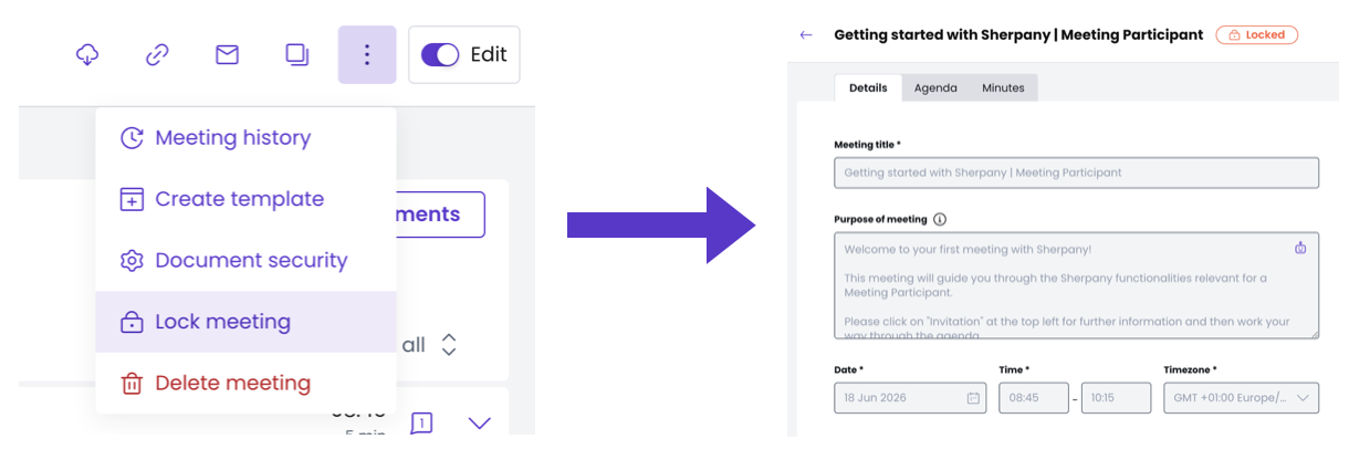 Durch das Sperren einer Sitzung können Organisatoren den Inhalt der Sitzung (Details, Agenda und Protokoll) einfrieren, sodass keine weiteren Änderungen vorgenommen werden können. Dies verhindert versehentliche Bearbeitungen und trägt zur Einhaltung von Vorschriften bei, insbesondere in regulierten Branchen. Eine Sitzung kann gesperrt werden, sobald die Agenda veröffentlicht wurde. Das Protokoll kann sich in einem beliebigen Status befinden. Das Sperren hilft dabei: