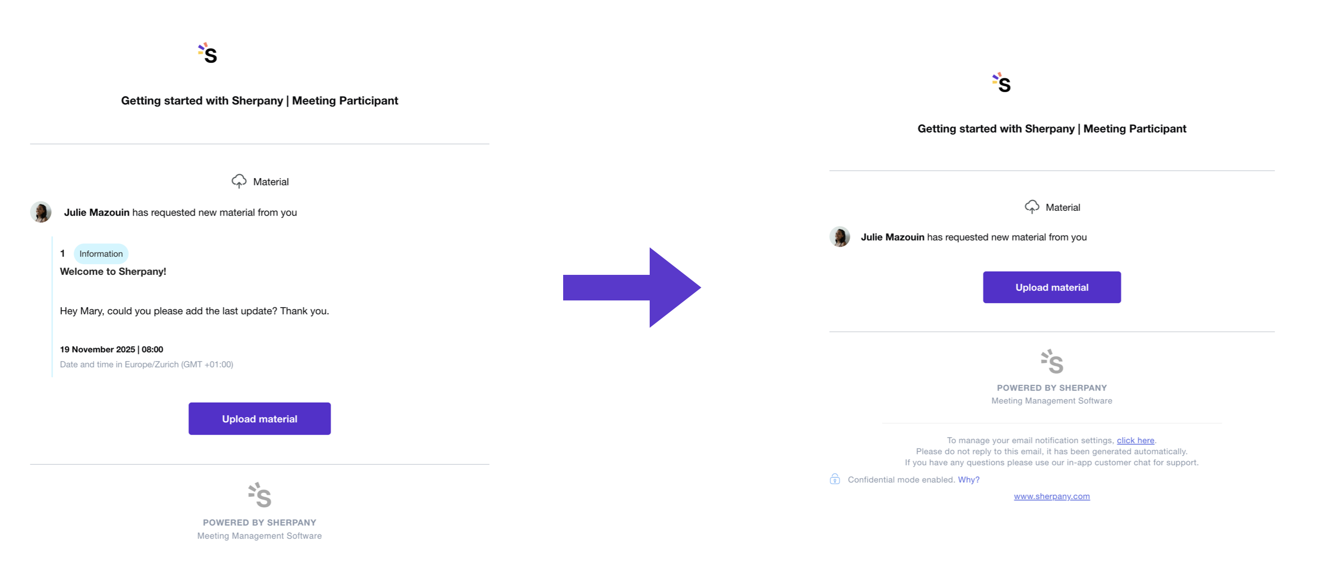 Even when Confidential Mode is enabled, users will continue to receive all email notifications (before, during, and after meetings). The difference is that sensitive content (such as agenda item titles, text, dates, comments, etc.) is removed, while still encouraging participants to take action and stay engaged.