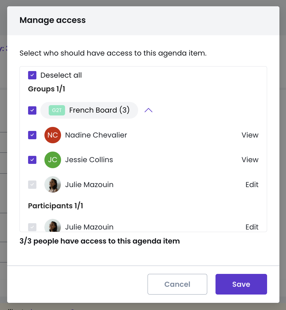 - Agenda items - Access is tied to meeting invitations. If a user is invited to a meeting, they can see all agenda items, unless specific restrictions apply.